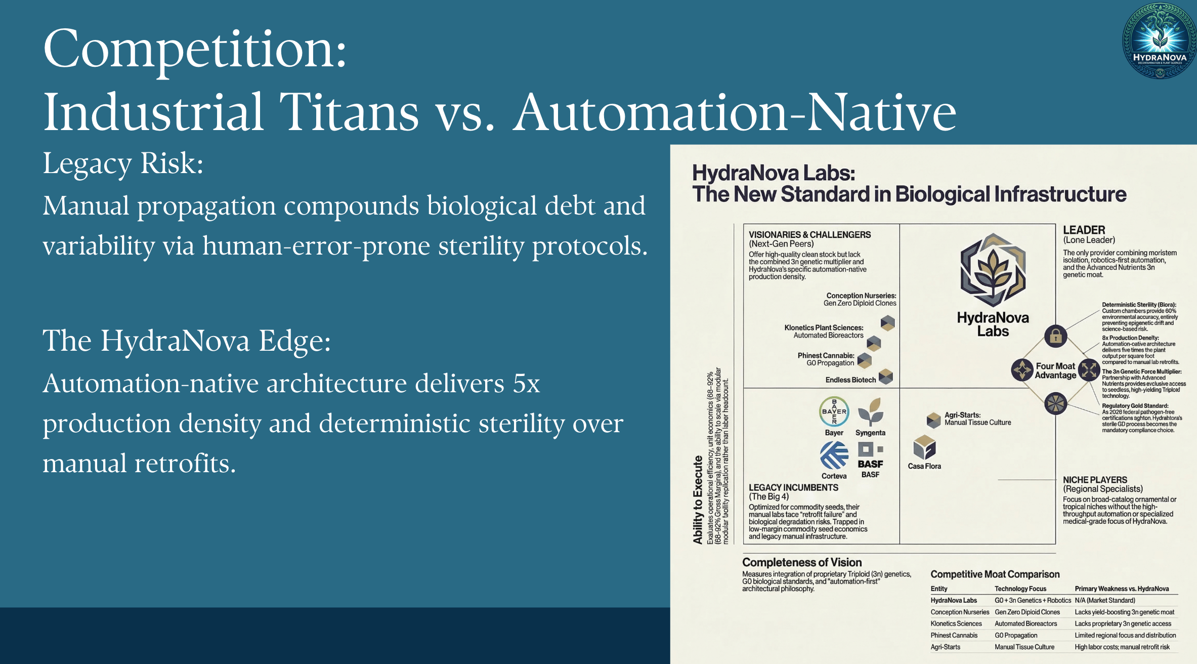 After: Ben specifically asked for a Gartner-style quadrant chart with competitor logos. The revised slide delivers exactly that. It maps the competitive landscape across two axes: "Ability to Execute" and "Completeness of Vision." Legacy incumbents like Bayer, Syngenta, Corteva, and BASF sit in the lower left as high-execution but low-vision players locked into commodity seed economics and manual infrastructure. Next-gen peers like Conception Nurseries, Klonetics Plant Sciences, and Phinest Cannabis are positioned as visionaries who offer high-quality clean stock but lack HydraNova's specific combination of automation-native production density and proprietary 3N genetics. HydraNova sits alone in the leader quadrant.