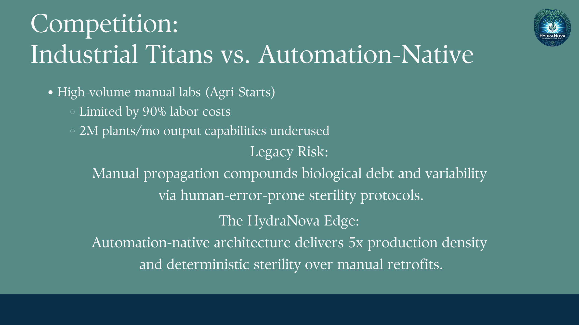 Before: The original slide made strong claims about HydraNova's edge. It called out high-volume manual labs as being limited by 90% labor costs, flagged the legacy risk of manual propagation compounding biological variability, and stated the automation-native architecture delivers 5x production density. All solid positioning points. But it was entirely text-based. If you're an investor scanning a deck, you're reading a paragraph and trying to mentally map who the competitors are and where this company fits. That's too much cognitive work for a single slide.