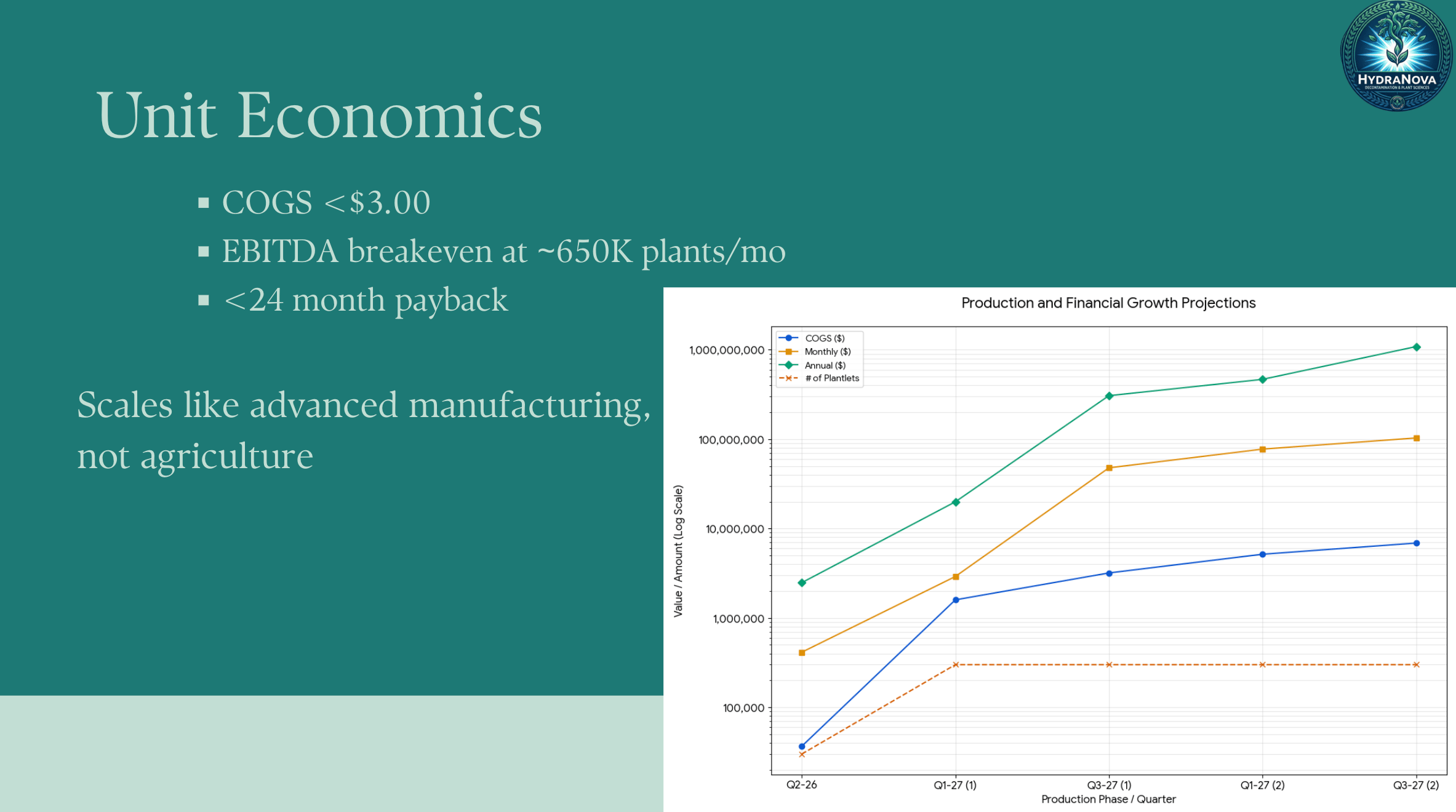 After: Ben's feedback was direct: combine them. The revised version puts unit economics on the left with the growth projections chart, and the business model on the right with the tiered pricing visual. A single tagline ties it together at the bottom: "Scales like advanced manufacturing, not agriculture." One slide, one financial narrative. The investor sees cost structure, pricing model, margins, and growth trajectory all in one view without flipping back and forth.